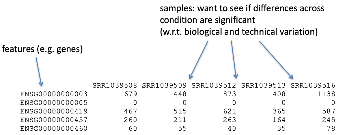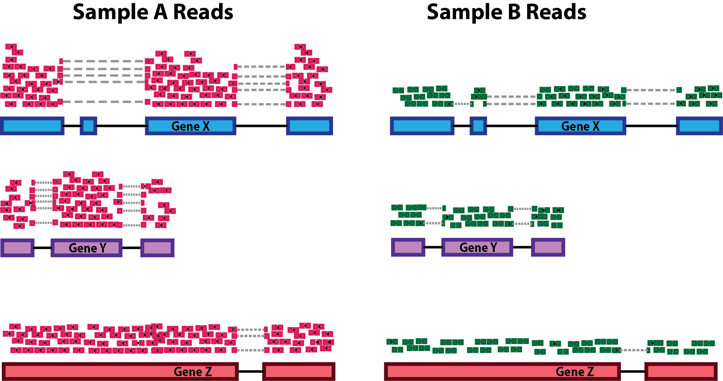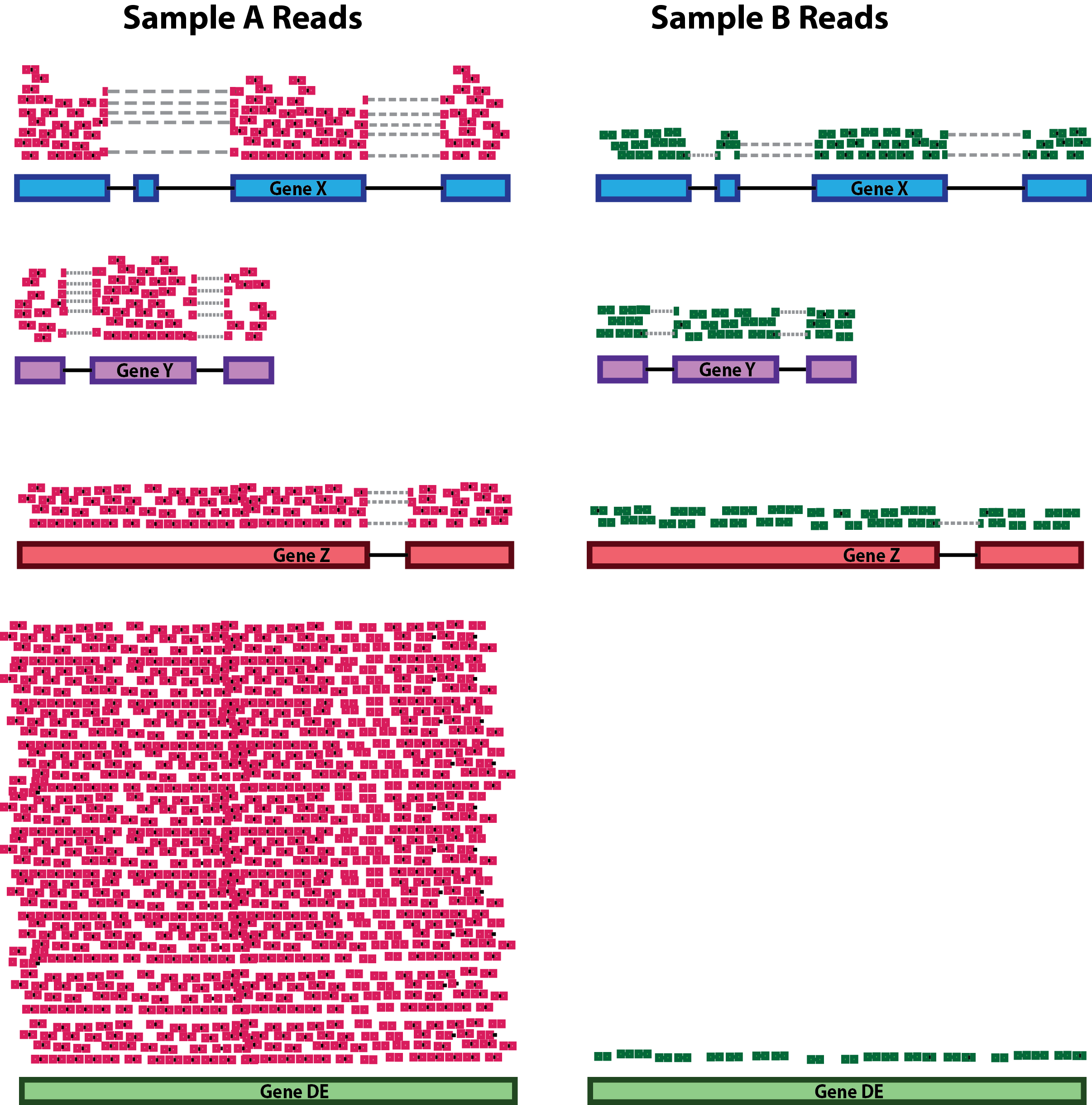 - Sequencing depth: total number of reads sequenced for a sample. Accounting for sequencing depth is necessary for comparison of gene expression between samples. In the example below, each gene appears to have doubled in expression in Sample A relative to Sample B, however this is a consequence of Sample A having double the sequencing depth.