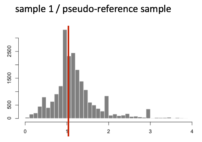The figure below illustrates the median value for the distribution of all gene ratios for a single sample (y-axis is the frequency).
