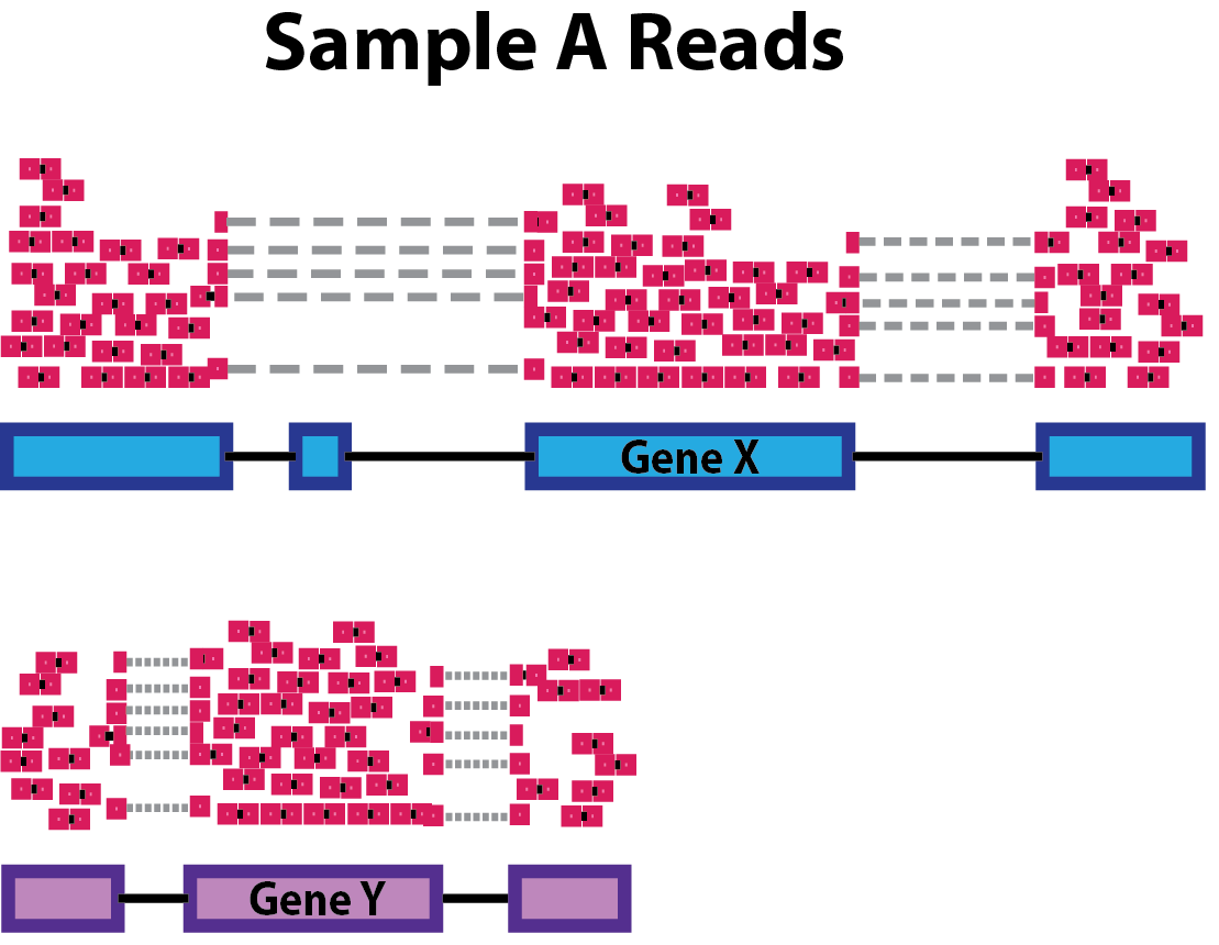 - Gene length: Accounting for gene length is necessary for comparing expression between different genes within the same sample. In the example, Gene X and Gene Y have similar levels of expression, but the number of reads mapped to Gene X would be many more than the number mapped to Gene Y because Gene X is longer.
